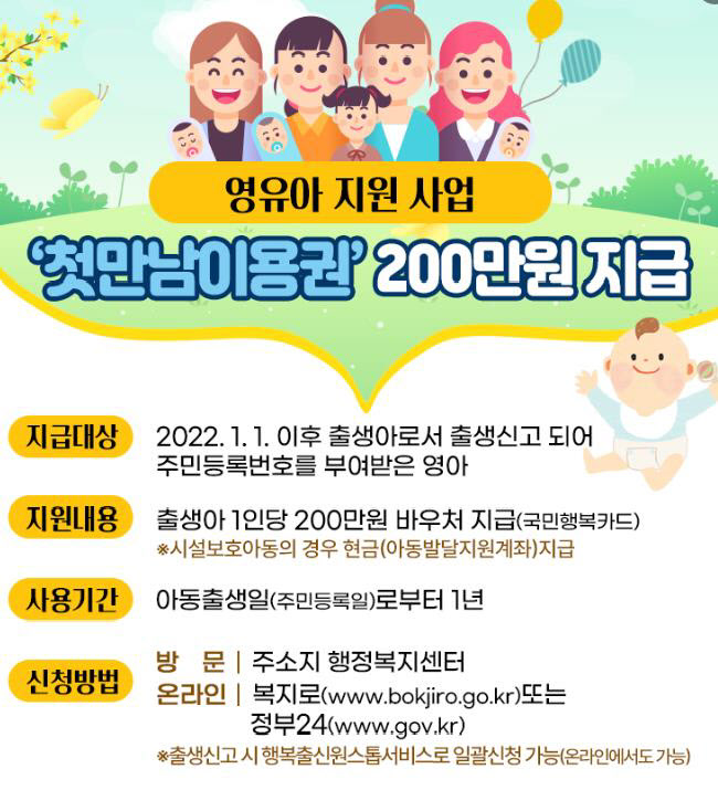 출생 아동에게 200만원의 첫만남 이용권을 지급하여 생애 초기 아동양육에 따른 경제적 부담을 경감하는 주제에 대해 알아보겠습니다. 이 프로그램은 아동의 출생과 초기 양육을 지원하고, 부모의 경제적 부담을 줄이기 위해 도입되었습니다.